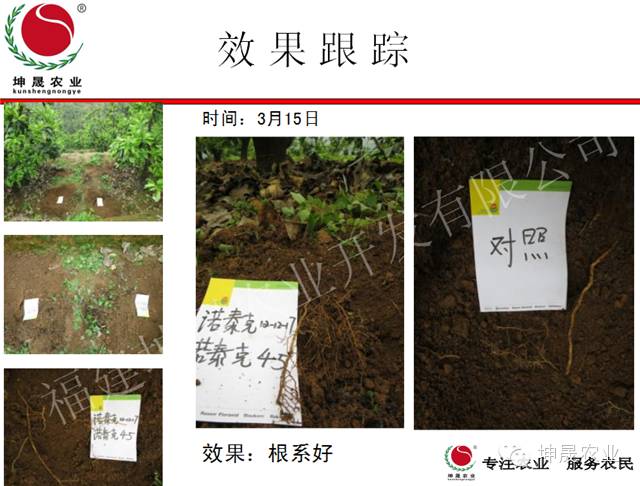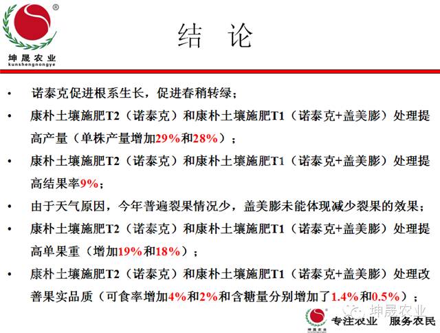 选取漳州平和山地蜜柚园使用康朴土壤施肥方案,结果显示康朴土壤施肥(诺泰克)和(诺泰克+盖美膨)处理可以提高产量,分别单株产量提高29%和28%,结果率提高9%,单果重提高19%和18%,同时可以改善品质,可食率增加4%和2%,含糖量增加1.4%和0.5%。诺泰克具有促进根系生长,春梢转绿的作用。