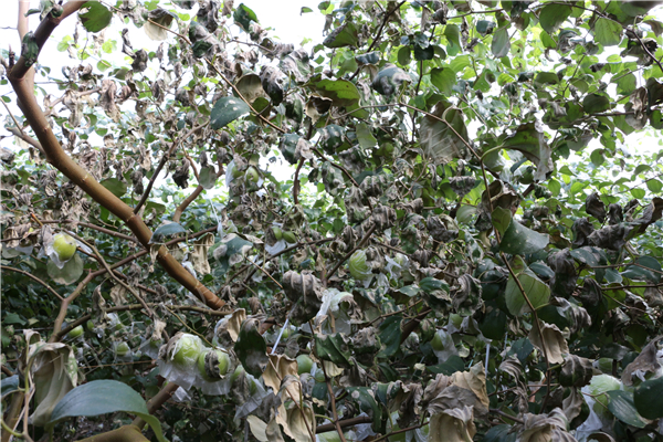 叶片开始发病,干枯,病菌扩散速度快,整个果园像喷完除草剂一样,绿色的叶片全部变为灰色