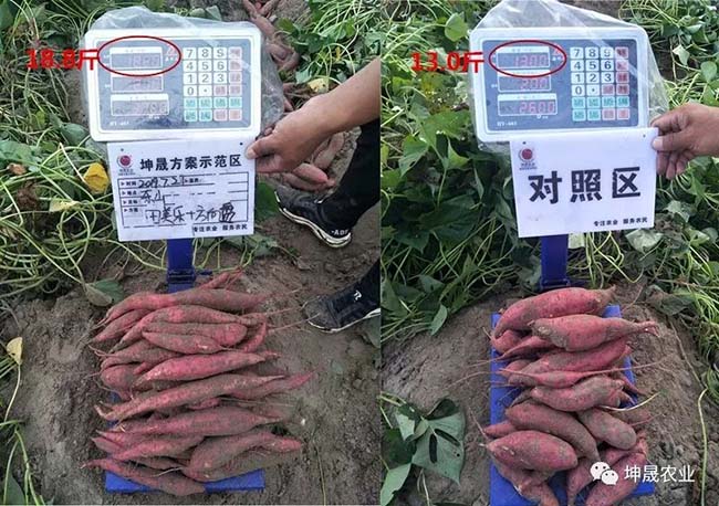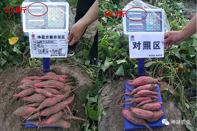 对照区地瓜条数明显较少,条形较差且大小不均匀,两堆平均重量为12.67斤。