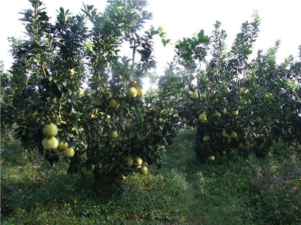 杂草的覆盖有三点好处,一是有保水保肥保土的功能;二是益虫的栖息处,防治打药的时候也杀死益虫,平衡果园生态;三是杂草虽然吸收土壤部分肥料,在蜜柚收获后除草可以获得有机肥养树,草根能够帮助柚园土壤通风透气,省得翻耕土地。