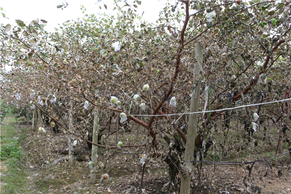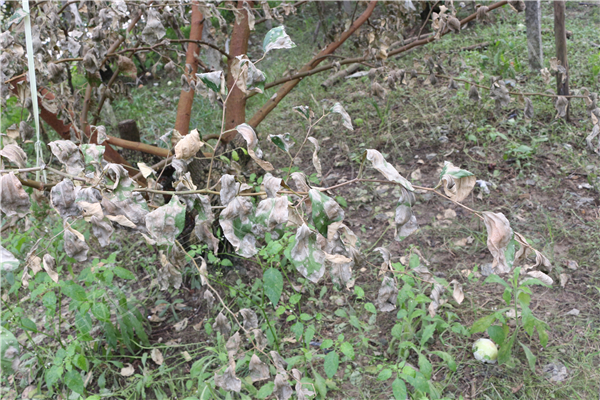 叶片开始发病,干枯,病菌扩散速度快,整个果园像喷完除草剂一样,绿色的叶片全部变为灰色