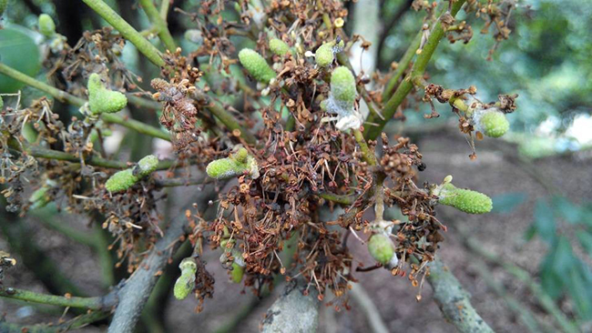 清明过后荔枝山上本应花香飘鼻、漫山金黄,可呈现在小编眼前的却不是此场景——一撮撮的黑色花序挂满了漫山的荔枝树。