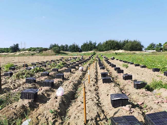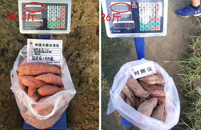 在试验区和对照区生长环境差不多的位置随机选取3个点,每个点10株,拔出地瓜,数条数和测重量;
