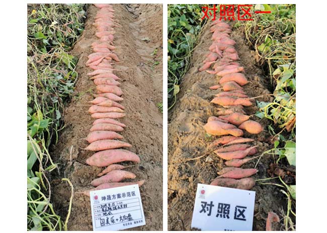 试验区地瓜条数平均每株比对照差不多,整体大小较均匀且条形好,平均每10株重量为35.32斤,每亩地比对照区一平均增产1000斤,比对照区二平均增产2000斤;
