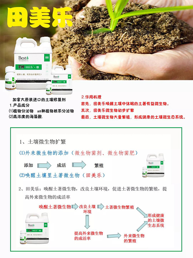 田美乐是一种通过迅速唤醒土壤中休眠的有益土著微生物,并加速其繁殖,来达到恢复土壤微生物群落的多样性,重新构建健康土壤微生态系统,进而解决各种土壤问题的土壤修复剂。