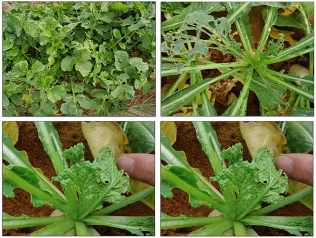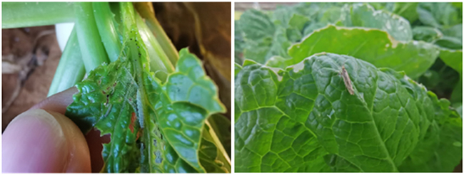 为了更直观、真实的体验“格力高”防治功效,技术员带领大家一起进入田间去发掘虫子的藏身处,发现使用过“格力高”的植株很难找到虫子及其粪便的身影,而对照组在新叶里、老叶边、茎干上随处可见。