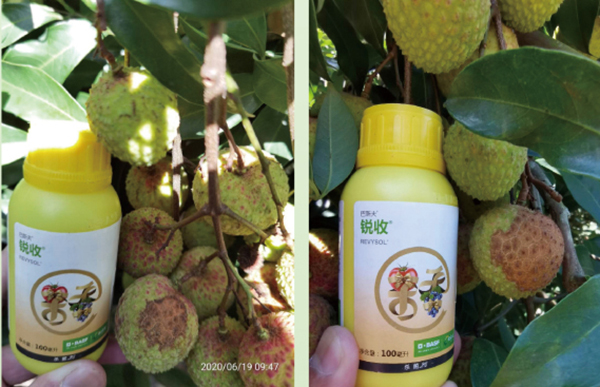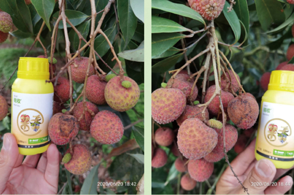 1、转色后期炭疽病危害,造成荔枝“黑壳”问题:锐收果香2000倍液喷雾