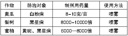 生产厂商:中农联合 有效成份:40%腈菌唑 剂型:可湿性粉剂 规格:3克×50包×10袋 30克×10包×10袋 登记对象及使用方法: