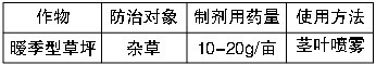 注意事项: 1.暖季型草坪每季最多使用1次;对冷季型草坪敏感性高。 2.勿重新用药,本剂除草活性高,请严格掌握用药量。
