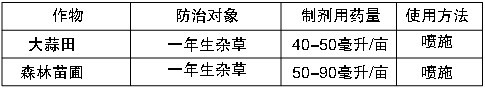 注意事项: 1.本品为触杀型除草剂,切勿喷及作物,每季作物最多使用1次。 2.本品不可与呈碱性农药等物质混合使用。