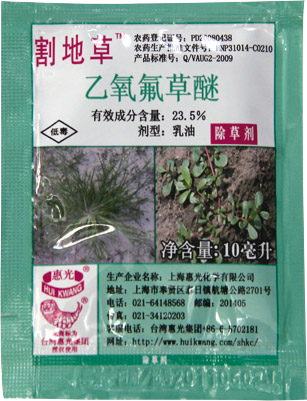 生产厂商:上海惠光 有效成分含量:23.5%乙氧氟草醚 剂型:乳油 规格:10毫升X100包X10盒 登记对象及使用方法: