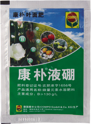 生产厂商:德国康朴 主要成分:纯硼≥130g/L 剂型:液剂 规格:10ml×100×4盒;150克×60瓶 产品特点及功能: 1.高纯度多聚硼酸溶液,含有较强铺展性能的表面活性剂。 2.减少落花落果、提高坐果率、减少畸形果。 适用作物:果树、蔬菜开花前、初花期使用。 使用方法:1000-1500倍液叶面喷施