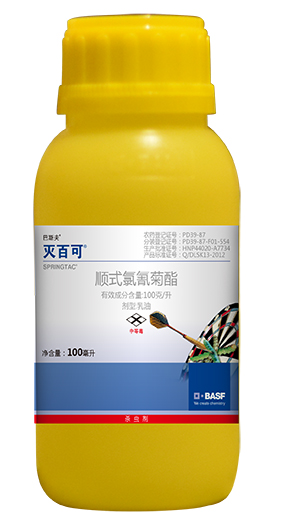 生产厂商:德国巴斯夫 有效成分含量:100克/升顺式氯氰菊酯 剂型:悬浮剂 规格:10毫升×50包×6盒;100毫升×50瓶 登记对象及使用方法: