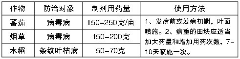 注意事项: 1.本制剂有少量沉淀,摇匀后施用,不影响药效。 2.水稻病毒病是由灰飞虱传播的,施药时注意防虫,该产 品与中、酸 性农药可混配。 3.本产品安全间隔期10天。